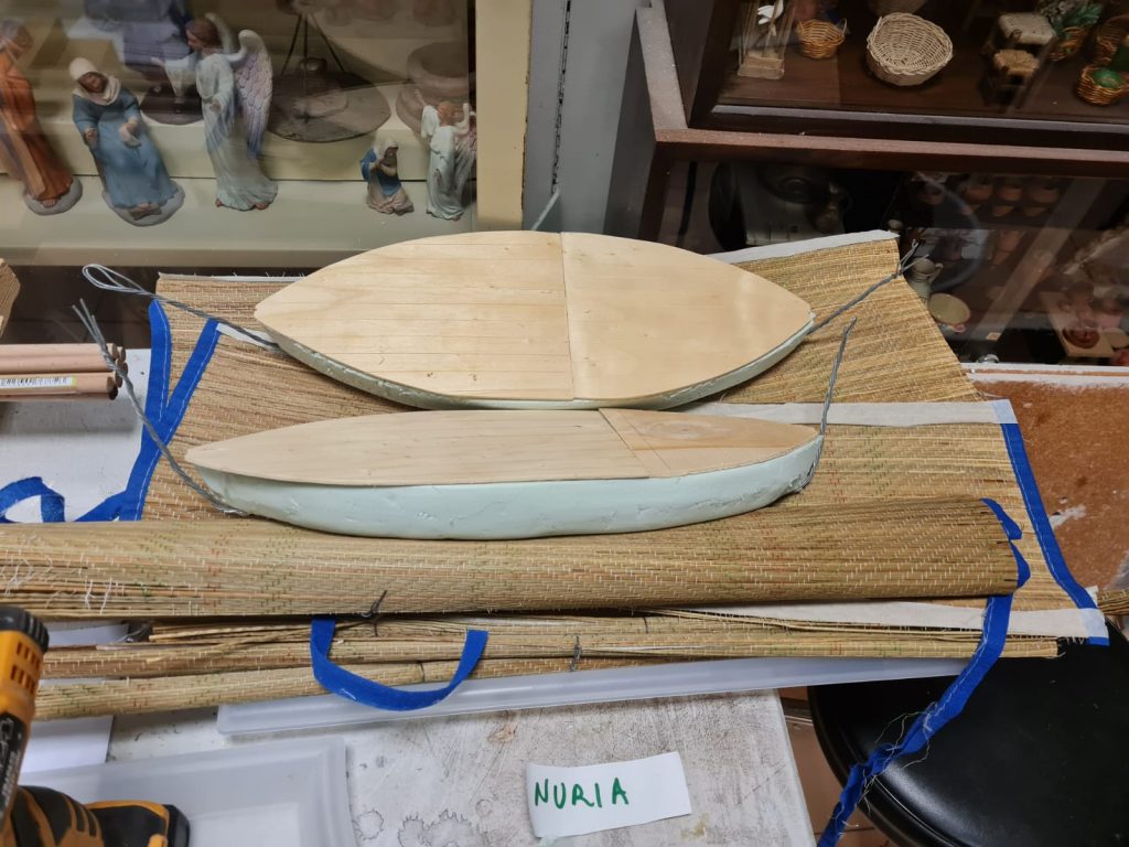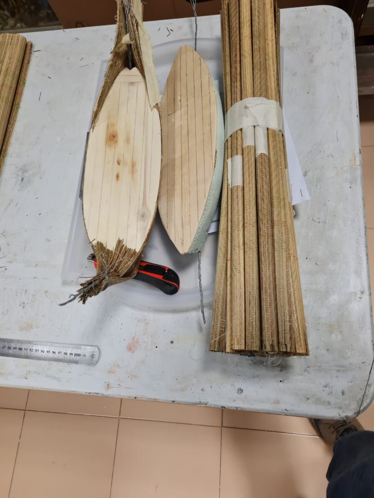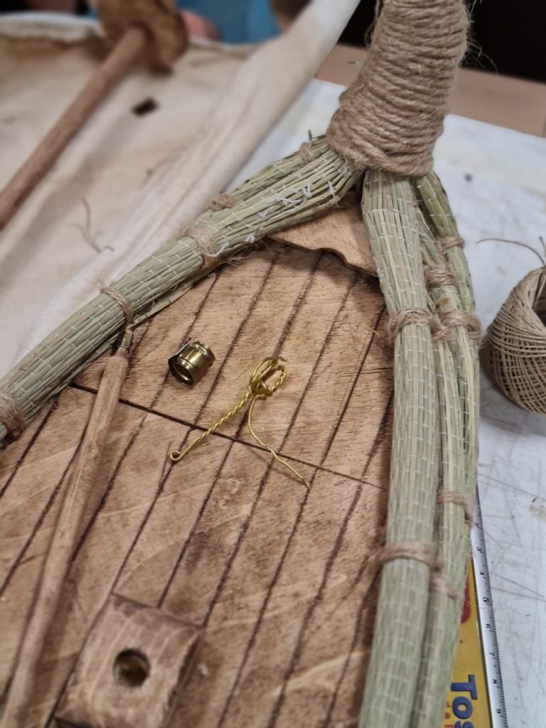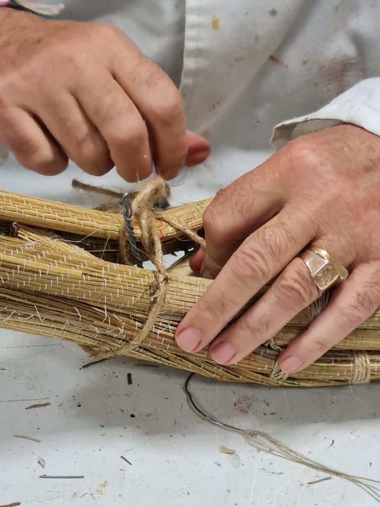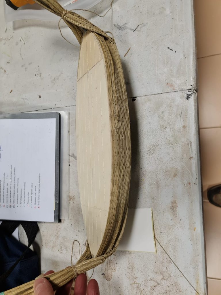 La parte inferior del casco que en los barcos reales estaba formada por haces de papiro atados la forraremos con una esterilla de playa. Este material tiene una textura que imita muy bien los tallos de papiro trenzados. Cortaremos la esterilla a medida y la pegaremos sobre el porexpán para cubrir toda la superficie. Con los restos, elaboraremos rulos o cilindros enrollando tiras de la misma esterilla. Estos rulos se colocarán en los laterales del casco, uniéndolos con alambre fino para mantenerlos firmes y conseguir el aspecto de haces atados. Finalmente, reforzaremos toda la estructura cosiendo las uniones con hilo de bramante, lo que aportará un acabado artesanal y realista, como si fueran las cuerdas que mantenían unidos los haces de papiro originales.