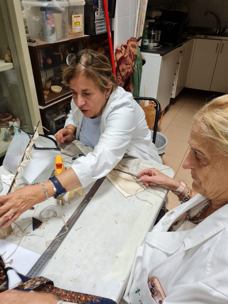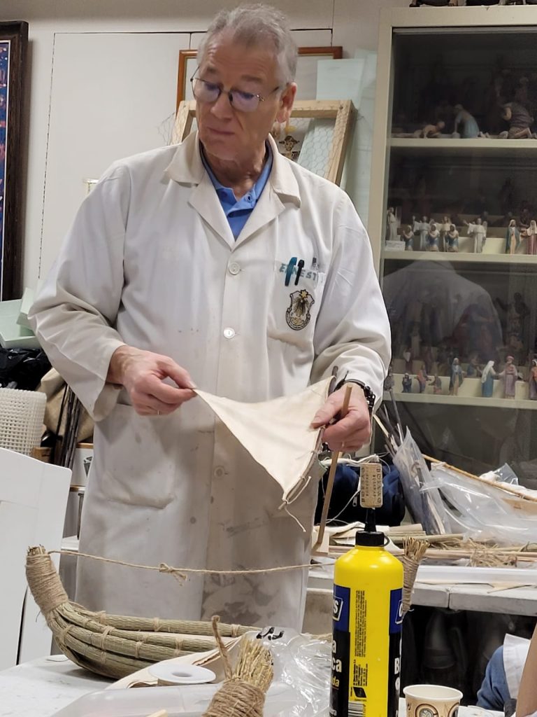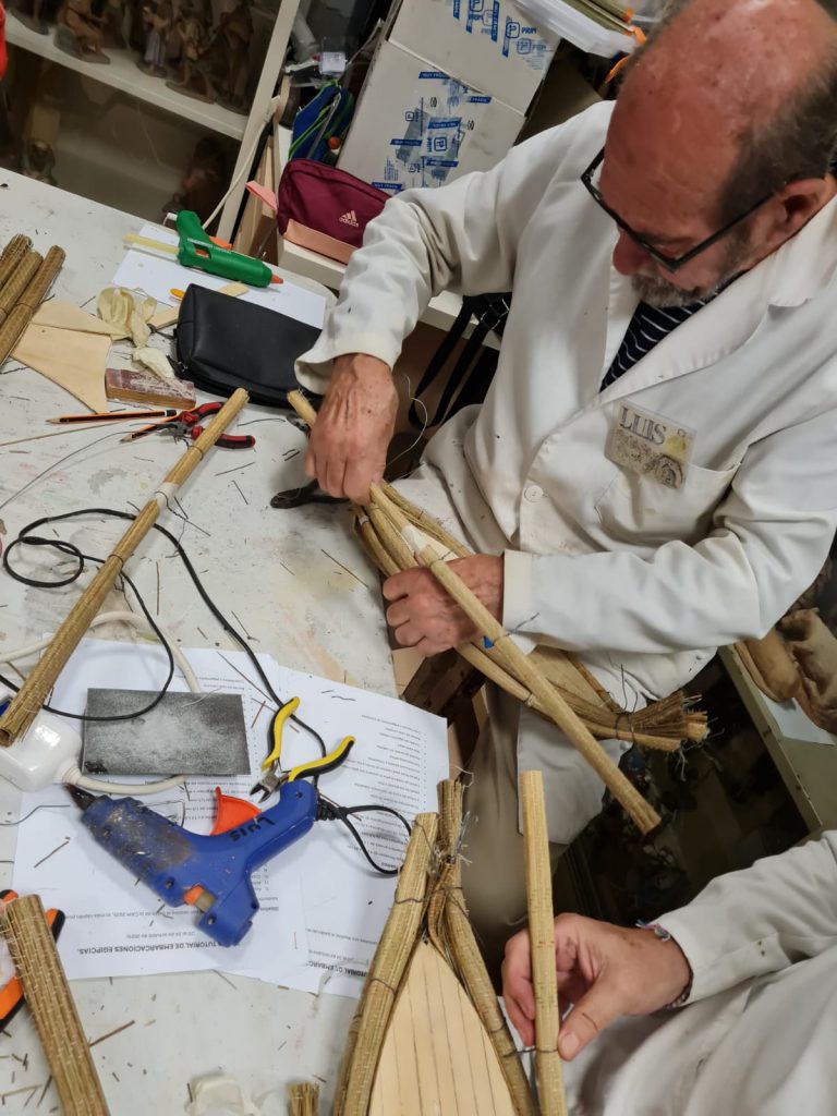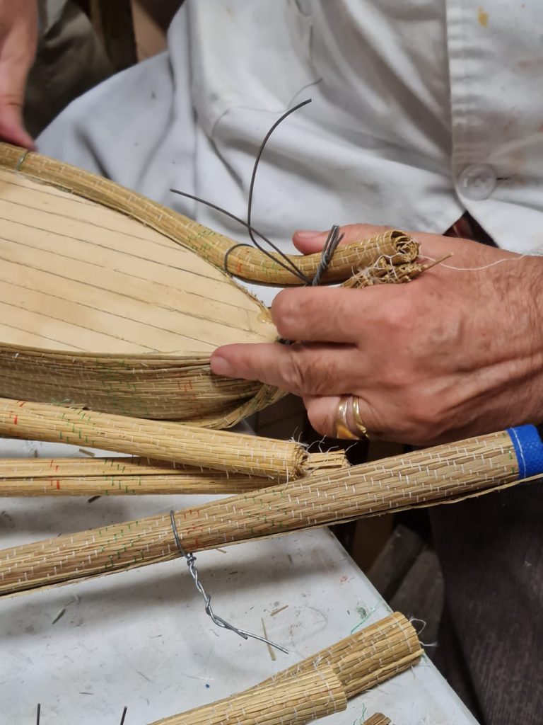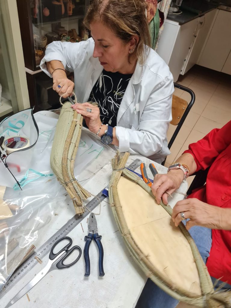 La parte inferior del casco que en los barcos reales estaba formada por haces de papiro atados la forraremos con una esterilla de playa. Este material tiene una textura que imita muy bien los tallos de papiro trenzados. Cortaremos la esterilla a medida y la pegaremos sobre el porexpán para cubrir toda la superficie. Con los restos, elaboraremos rulos o cilindros enrollando tiras de la misma esterilla. Estos rulos se colocarán en los laterales del casco, uniéndolos con alambre fino para mantenerlos firmes y conseguir el aspecto de haces atados. Finalmente, reforzaremos toda la estructura cosiendo las uniones con hilo de bramante, lo que aportará un acabado artesanal y realista, como si fueran las cuerdas que mantenían unidos los haces de papiro originales.