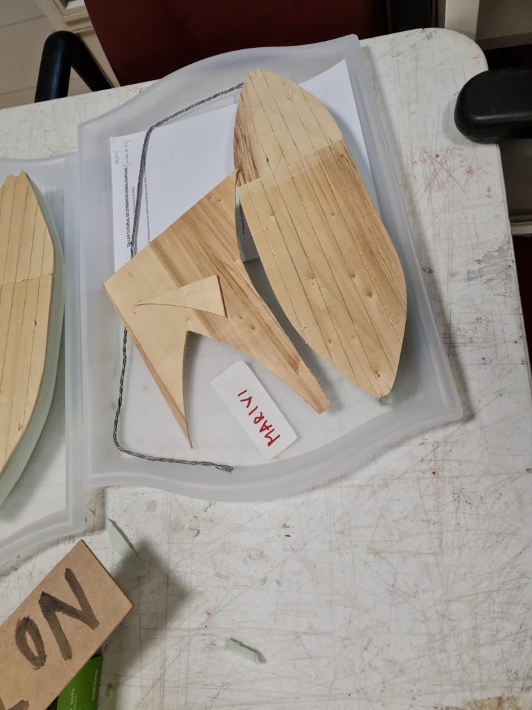 Una vez tengamos el cuerpo del barco listo, pasaremos a crear la cubierta. Usaremos láminas finas de madera o listones de balsa, que cortaremos a medida para cubrir la parte superior del casco. Este revestimiento aportará un toque realista y además reforzará la estructura, imitando las planchas de madera que, en los barcos más grandes, se utilizaban para crear una superficie firme donde se colocaban las cargas o se movía la tripulación. Podemos pegar las láminas con cola blanca o silicona caliente, cuidando que queden alineadas y bien ajustadas al contorno del barco.
